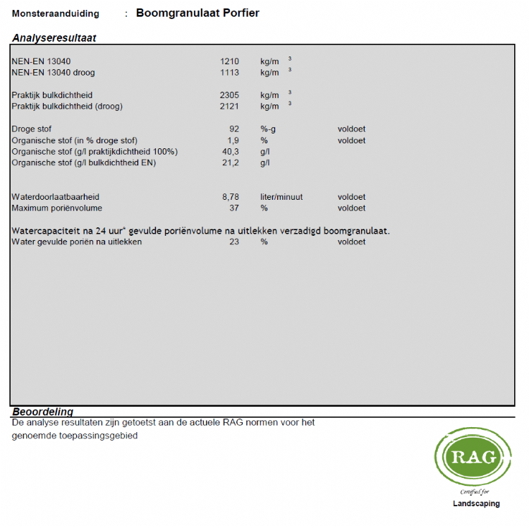 Naast een goede draagkracht moet een RAG-bomengranulaat minimaal 35 procent poriën hebben en in verdichte toestand minimaal 1 l water/m2/min doorlaten. De waterbuffer moet minimaal 10 procent zijn.