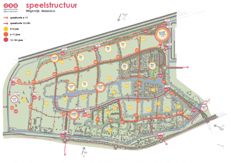 'De wijk Wilgenrijk in Maassluis (zie tekening ontwerp) is een mooi voorbeeld van hoe het ook kan. In het Actieplan Spelen 2018-2028 en het concept-speelruimtebeleidsplan 2018 is beschreven dat Maassluis wil dat kinderen langer en vaker buiten spelen. Ook ziet de gemeente graag dat kinderen veel kunnen beleven en zich dit blijven herinneren: verstoppertje spelen, hutten bouwen, rustig zitten, de seizoenen en zintuigen ervaren en eigen grenzen ontdekken. Jeugdigen die later aan hun stad denken als dé plek waar ze uitgedaagd werden, daar gaat de gemeente Maassluis voor. In Maassluis is rekening gehouden met de leeftijdsopbouw van kinderen en zijn voorzieningen per categorie ingetekend. Voor Wilgenrijk is dus het aantal woningen dat in een bepaalde fase zal worden gebouwd, uitgezet tegen de normen, zodat een goed overzicht ontstaat van het totaal aantal kinderen, jeugdigen en jongeren op een bepaald moment, maar ook per speelwijk. Daardoor kon een toekomstgerichte speelstructuur geadviseerd worden. Dat is geen blauwdruk van hoe het precies wordt, maar wel een duidelijke indicatie dat er rekening gehouden wordt met het spelende kind. Uitgaande van de ontwikkeling van de doelgroepen en de normen voor speelruimte, zouden er voor jongeren minimaal drie tot vier goede buurtsport- en -ontmoetingsplekken moeten zijn, voor jeugdigen vijf tot zes goede buurtspeel- en -sportplekken en voor kinderen elf plekken. Daarbij kunnen op locaties die groot genoeg zijn prima plekken gecombineerd worden voor mensen van 0 tot 99 jaar. Minimaal een van deze plekken zou een bovenwijkse functie kunnen hebben. Verder moet er voor kinderen een structuur van steunplekken zijn in buurten waar relatief veel kinderen wonen, en daarnaast moet er op centrale buurtplekken ruimte voor kinderen zijn.'