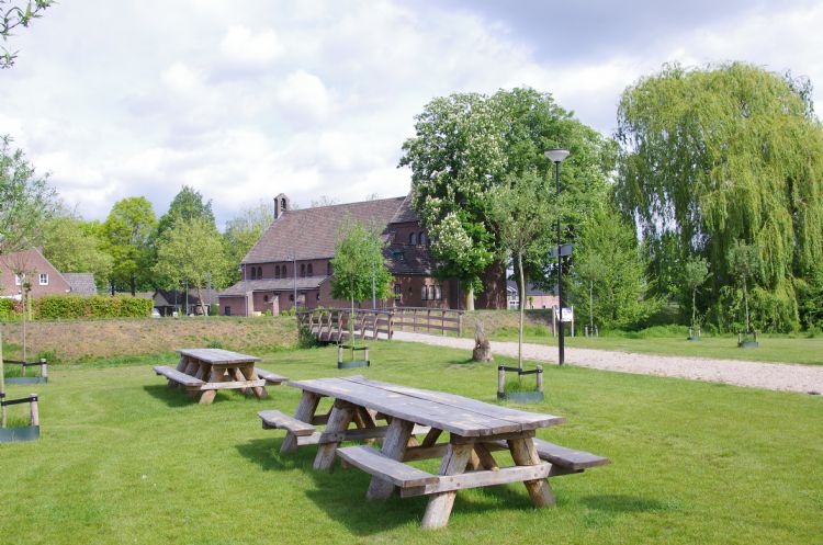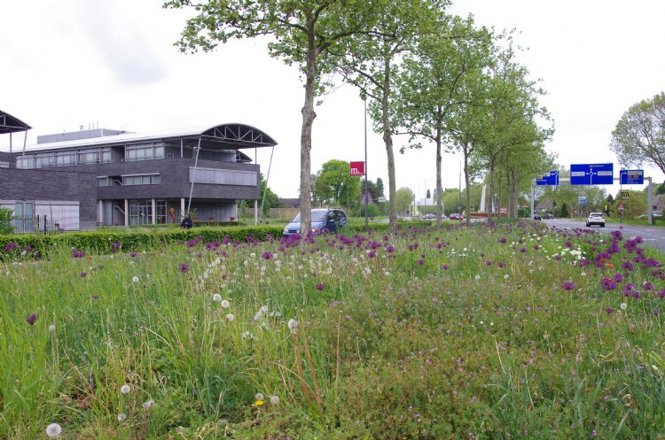 Kleur vinden we ook terug in de middenberm van de Eindhovenseweg. Het is het juiste moment om de bloemenpracht te aanschouwen die voortkomt uit het gebruik van stinsenplanten, een selectie van bol-, knol-, en wortelgewassen in combinatie met een ingezaaid bloemenmengsel. Weert geeft daarmee gevolg aan haar ambitie om de biodiversiteit in de stad te verbeteren. 'Weert is altijd al een groene gemeente geweest, maar in het meest recente raadsprogramma wordt groot ingezet op "groen voor grijs". Het streven naar biodiversiteit speelt daarin een belangrijke rol. Wat we hier langs de Eindhovenseweg zien, is daar een kleurrijk voorbeeld van', legt Van den Heuvel uit. De tocht voert verder naar de Laarderschans en het Naoleveldje. Ook daar wordt stilgestaan bij een stuk Weerter historie. In teksten uit de 17e eeuw wordt gerept over de schans als een schuilplaats tegen rondtrekkende plunderaars. Later is het bouwwerk aan de kerk geschonken en verrees er een kerkje op de door een wal en een gracht omgeven schans. Inmiddels heeft de gemeente, met respect voor de historie van dit stuk grond, een groenproject ontwikkeld op en om de locatie. Dat voorziet de nabijgelegen nieuwbouwwijk van een ruim bemeten recreatie- en speelveld, het Naoleveldje. 'We hebben hier de gracht intact gelaten, om recht te doen aan de geschiedenis. De natuur rondom de kerk oogt als een kerktuin. Ook daar hebben we wat er al was zoveel mogelijk ingepast in de groenvoorziening die we hier voor ogen hadden.'