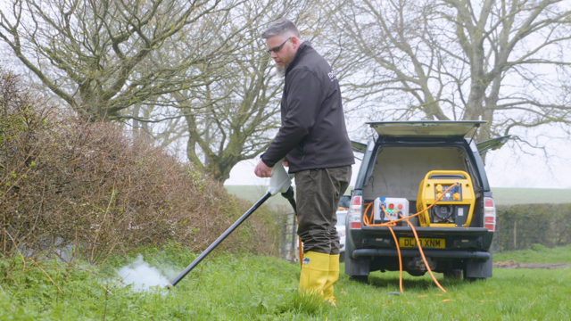 De Rootwave Pro-onkruidbestrijder bestrijdt onder andere invasieve exoten met wortel en al. De pin aan de lans wordt tegen de stengel aan gehouden. Vervolgens gaat er stroom door de stengel en de wortel. Het vocht in de stengel en wortel gaat koken door de natuurlijke weerstand van de celwanden; de celwanden knappen en gaan kapot. Vervolgens gaan plant en wortel dus dood. 'Wie de planten behandelt, ziet daadwerkelijk de stoom uit de plant komen', legt Gerrit uit. 'Exoten als reuzenberenklauw en Japanse duizendknoop mogen niet meer doodgespoten worden. De Rootwave Pro biedt een effectief alternatief voor spuiten.' De Rootwave Pro kan ingesteld worden op 3000 tot 5000 volt met 1 tot 1,5 ampère.