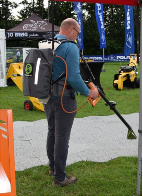 Dit brengt ons direct op het derde product, gloednieuw gearriveerd uit Oostenrijk: het ruggedragen accustation van Makita. In dit accustation gaan vier losse Makita-accu's, zoals je ze kunt vinden in ieder Makita-accugereedschap. Volgens Moniek van de Coevering van Makita heeft dit als grote voordeel dat wanneer er een accucel kapot is je slechts één accu á 95 euro hoeft te vervangen. Je hoeft hierdoor niet langer de hele ruggedragen accu te vervangen. Daarnaast kost het nieuwe ruggedragen accustation 860 euro inclusief vier accu's, exclusief btw. Dit maakt hem significant goedkoper dan de ruggedragen accu's van andere merken waarbij je al gauw uitkomt op zo'n 1200 á 1300 euro. Kortom een fijne ontwikkeling voor hoveniers die op de kleintjes letten.
