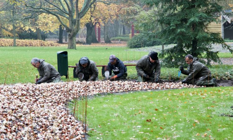 Op 13 november loop ik met voorman Stefan Slobbe door het park. Overal zitten planters geknield in de bedden. Ze steken hun platte troffel loodrecht in de grond, om er handmatig en vakkundig - steeds vier vingers uit elkaar - vooral tulpen te planten; een indrukwekkend gezicht. Onze nieuwe JUB-borders (de tuinlieden noemen ze de 'ribbels', omdat ze verhoogd zijn) liggen er nu nog maagdelijk bij, maar vanaf a.s. maandag zullen hier meer dan 20.000 bollen worden aangeplant, respectievelijk 46 en 48 verschillende soorten per border. Een deel van de bollen is dit jaar biologisch geteeld.