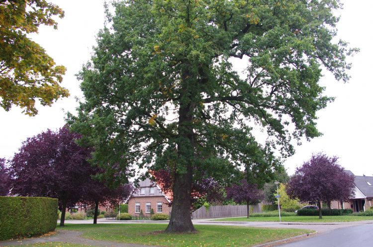 De eerste stop op de rondgang door Tubbergen is bij een tweetal grote eiken bij basisschool De Wiekslag. 'Te groot voor deze locatie', vindt Volmerink. Ze staan te dicht op woningen en moeten om veiligheidsredenen geregeld gesnoeid worden. 'Dat is intensief en duur onderhoud. Dat willen we in de toekomst anders.'