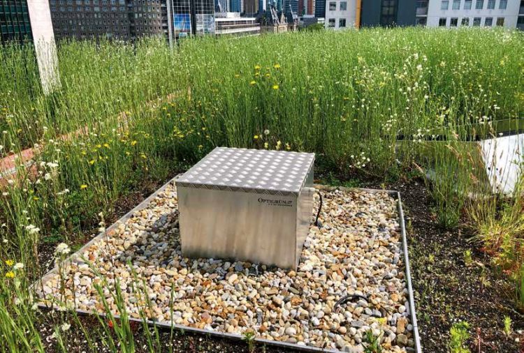 De prijswinnende innovatieve 'Smart Flow Control' van Optigrün is een weerdata gestuurde klep op het dak die het hemelwater in de BR Retentieboxen kan bergen of afvoeren op het moment dat er meer neerslag voorspeld wordt dan er aan bergingscapaciteit is. Dit voorkomt nog beter wateroverlast en maakt het gebouw hoosbui-proof.