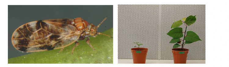 De bladvlo Aphalara itadori en effect in het lab (linkerplant: de bladvlo remt de groei, rechterplant: controle). Foto's: CABI