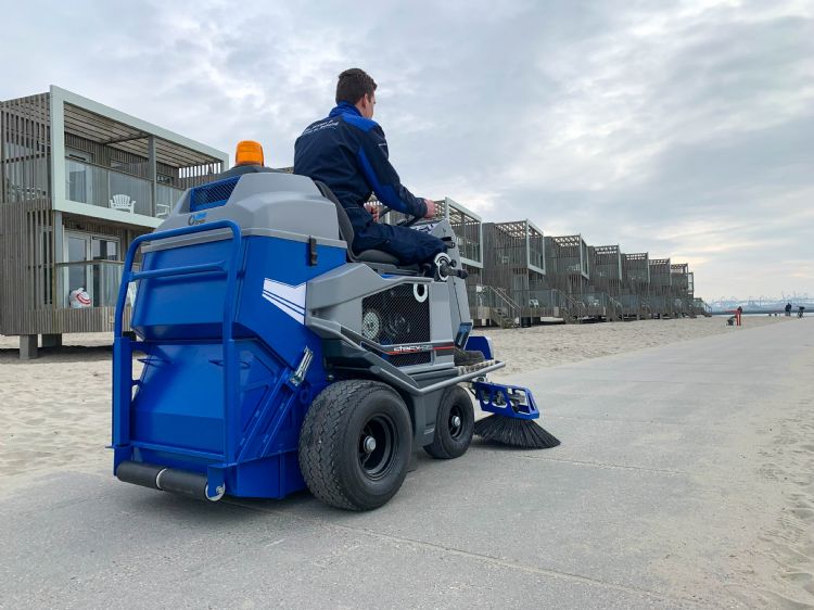De borstels zijn van nylon en geschikt voor elke ondergrond. 'De veegmachine heeft een centrale borstel van 70 cm en twee zijborstels. Met behulp van rubberen flappen wordt de ruimte op de grond bij de centrale borstel vacuüm gezogen. De voorborstels brengen het vuil naar het midden van de machine, waar de centrale borstel het goed kan opvegen en opzuigen. Met de inzet van de twee zijborstels is de werkbreedte 1,35 m', vertelt Steenks. 'De borstel linksvoor kun je ook naar de rechterzijkant draaien, door in zitpositie het voetpedaal in te trappen; er wordt dan een blokkering ontkoppeld. Met een slinger bij de linkerknie kun je de borstel van links naar rechts draaien. Dan is de werkbreedte 1,21 cm en heb je meer veegbereik in hoeken en langs obstakels, zoals bij poten van bankjes, lantaarnpalen, klimrekpalen en prullenbakken.'