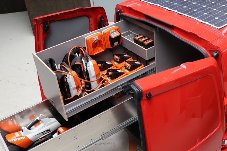 De Zeliox voedt diverse stopcontacten in de laadruimte die bestemd zijn voor andere elektrische apparaten. Voor het accuhandgereedschap is er plaats in de lange schuifladen van de onderkast die op laadvloer staat. Hierin ligt Stihl-materiaal voor elektrisch snoeien, bosmaaien en zagen. Daarbij kun je het zo opbergen dat je in een oogopslag ziet of alle machines aanwezig zijn. Onder de verhoogde laadvloer zitten twee ruimtes die doorlopen tot onder de cabine. Hierin kun je langer gereedschap als harken, schoffels en mogelijk zelfs ladders opbergen. De werkbus is minder hoog dan de ingerichte aanhangers. Mede door de verhoogde laadvloer kun je hier niet rechtop in staan. 'Vandaar de keuze voor deze lange, stevige schuifladen', aldus de woordvoerder van Brover. 'Je hoeft dus niet in de werkbus te klauteren om er gereedschap of accu's uit te halen. In de ingerichte aanhangers zit een kleine werkbank met onder andere een bankschroef. Die is in deze uitvoering weggelaten, maar naast de kasten is er nog steeds ruimte om bijvoorbeeld een kruiwagen te stallen.'
