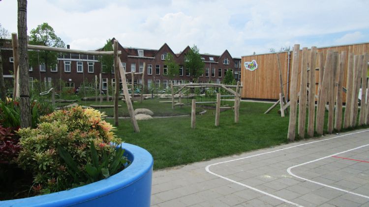 Water en zand, voor veel scholen toch wel wat spannend om zich hieraan te wagen. In Vlaardingen durfden ze het aan, omdat de wens er echt is om een stuk te vergroenen én omdat het als schoolplein met name door de oudere leerlingen (groepen 6, 7 en 8) wordt gebruikt. Waterbergingsuitdagingen (water bleef na hevige regenval lang staan op het plein) zijn opgelost door een wadi met speeleiland aan te leggen, die overtollig water opvangt en gelijk speelwaarde creëert. Met grind(putten) wordt gezorgd dat het water ook weer geleidelijk afgevoerd wordt. De speeltoestellen en speelaanleidingen, bruggetjes en oversteekjes maken het eiland tot een waar speelparadijs waar je je lekker kunt uitleven.