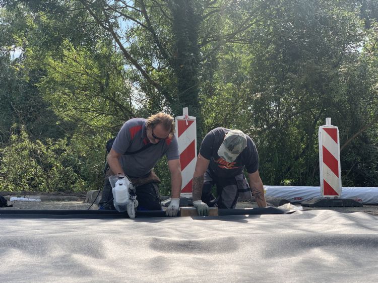 We ontmoeten Sean Helmus van het bedrijf op locatie. Het voorwerk is inmiddels verricht; de haard is één week geleden gemaaid door aannemer Dolmans Landscaping. Op diverse plekken steekt het plantje alweer flink uit de grond. Voor King Rootbarrier is het de eerste keer dat deze omstandigheden in een project samenkomen: de combinatie van water, talud en een aangrenzend pand. Vandaag wordt gebruikgemaakt van de nieuwe 'naaimethode': de Broof-Tech stitch techniek. Hierbij worden de delen van het onkruiddoek aan elkaar genaaid met foam ertussen. Zo is er gegarandeerd geen enkele opening tussen de doekdelen, dus maken zelfs de sterke duizendknoopwortels geen schijn van kans. Verder nieuw, vandaag, is het gebruik van geoptimaliseerde tweecomponentenlijm. Deze lijm heeft een lagere viscositeit en hardt sneller uit. Hiermee wordt vandaag het onkruiddoek tegen het aangrenzende gebouw aangebracht.
