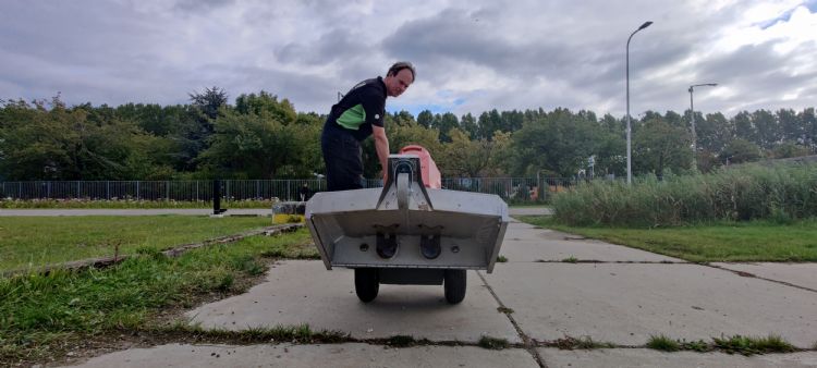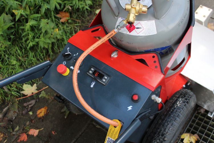Naast een draaiknop die de maximale werksnelheid regelt, is er dus ook een duimgashendel. Hoe verder je die indrukt, hoe sneller de centrale elektromotor de wielen aandrijft. Wat de werking tegen onkruid betreft, verwijst Van der Waal naar de ervaringen met eerdere WeedAir-types: 'Ik zag allereerst dat deze WeedAir veel bevestigingspunten voor het transport heeft. Dat is iets waar veel fabrikanten onvoldoende aandacht voor hebben. Juist als je er als zzp'er of hovenier mee van karwei naar karwei trekt, is het van groot belang dat je sjorbanden aan die hijsogen kunt bevestigen. De bediening ervaar ik als prettig en overzichtelijk. De ontstoken brander brandt duidelijk hoorbaar. Als dit niet het geval is, heeft er geen ontsteking plaatsgevonden. Verder produceert de machine maar weinig geluid. Zelfs trillingen van de aandrijving heb ik niet kunnen constateren.'
