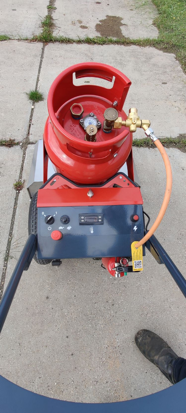 Ontwerper en fabrikant Hoaf laat enkele machines in de praktijk uitproberen, om eventueel verbeteringen te kunnen doorvoeren. Gert-Aart van der Waal viel de eer te beurt om als eerste de WeedAir 75 IBE te testen. Zijn bedrijf in Ridderkerk staat goed bekend als het gaat om tuin- en parkmachines. 'Vorig jaar bestonden we 75 jaar', vertelt hij met trots. 'De producent vroeg me het product te beoordelen. Ik deed dat alleen op de technische punten, dus niet op de efficiëntie van onkruidbestrijding. Het is een degelijke machine, die prima in elkaar zit. Zo zijn we dat ook van Hoaf gewend. Ik heb de positieve en negatieve aandachtspunten doorgegeven, zodat ze hier nog eens naar kunnen kijken. Wat mij betreft mag de producent de noodstop vervangen door een actieve dodemansknop.' Er is nu een noodstopknop gemonteerd op het dashboard. Deze schakelt de machine direct uit en in verband met het afkoelen blijft de ventilator draaien. Dit voorkomt oververhitting, mogelijk met brand tot gevolg. Van der Waal vervolgt: 'Een dodemansknop houd je tijdens het werk ingedrukt; zodra je hem loslaat, stopt de machine en wordt de gastoevoer naar de branders afgesloten. Dit maakt de machine in noodsituaties nog veiliger. Als de draaiknop op de minimale stand is ingesteld, is de werksnelheid 1,5 km/uur, ongeacht hoe ver je de duimgashendel indrukt. Je kunt ook de draaiknop naar rechts draaien; dan bepaal je met de duimgashendel de rijsnelheid. Die moet je dan altijd in de goede positie houden. Die snelheid van 1,5 km/uur is prima voor een goede werking, maar naar mijn smaak zouden er twee standen voor de werksnelheid op mogen zitten en nog een derde voor de transportsnelheid. Die is nu 3 km/uur, te langzaam als je een kilometer met de machine moet wandelen. Ik heb gepleit voor 4,5 km/uur als transportsnelheid.'