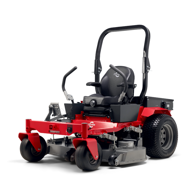 De stuurhendels kunnen desgewenst in hoogte worden ingesteld. Verder is deze Cramer-zero-turnmaaier standaard voorzien van een goed beklede en geveerde bestuurdersstoel met armsteunen die trillingen absorberen. Gebaseerd op de gewichtsinstelling kun je de veerweg van de bestuurderstoel instellen, om de veiligheid en het comfort te bevorderen. Op de machine zijn bovendien veiligheidsgordels gemonteerd. De machine remt automatisch af als de bestuurder niet aanwezig is of wanneer er een systeemfout optreedt. Ook kun je de machine op een elektrische handrem zetten, door de twee stuurhendels buitenwaarts te plaatsen. Dit vergemakkelijkt bovendien het verlaten van de machine. De machine, met een totaalgewicht van 630 kilo, heeft een modulaire bouw. Het frame bestaat uit een kokerbalkconstructie. In de vier hoekpunten van het frame zijn bevestigingspunten voor spanbanden, waarmee je hem tijdens transport goed en veilig kunt vastzetten op een aanhangwagen.