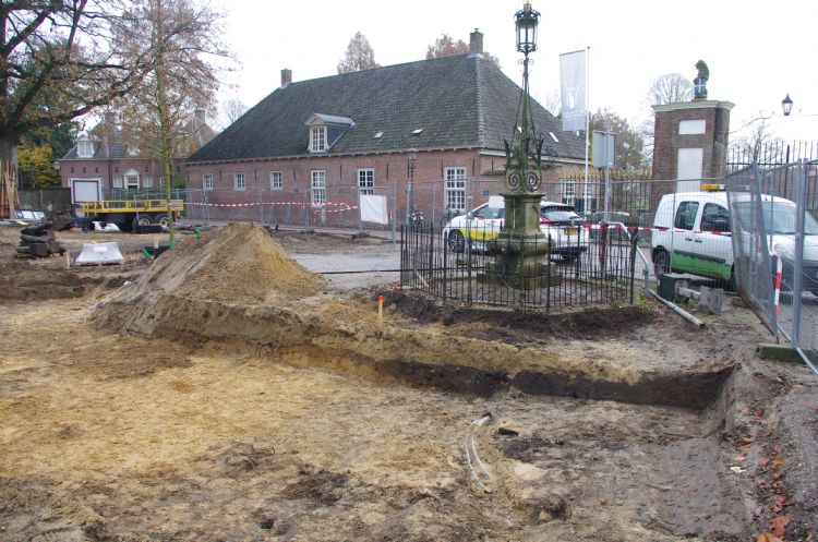 Verderop bezoeken we opnieuw een project waarbij waterretentie en bomen een belangrijke rol is toebedeeld: het Kasteelplein, onder de rook van Kasteel Amerongen in het oude historische dorp. Het plein is nu één groot werkgebied, een zandvlakte eigenlijk.