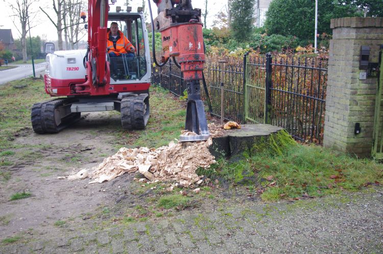 Een werkploeg is bezig met het uitboren van een eikenstobbe. De uitvoerder weet te vertellen dat ze op deze manier per boom ongeveer vier uur bezig zijn. 'Arbeidsintensief, maar onoverkomelijk. Er zitten hier grote gasleidingen in de bodem. Een kleine leiding kun je nog wel laten repareren, maar als we die grote jongens kapottrekken, hebben we een groot probleem.'