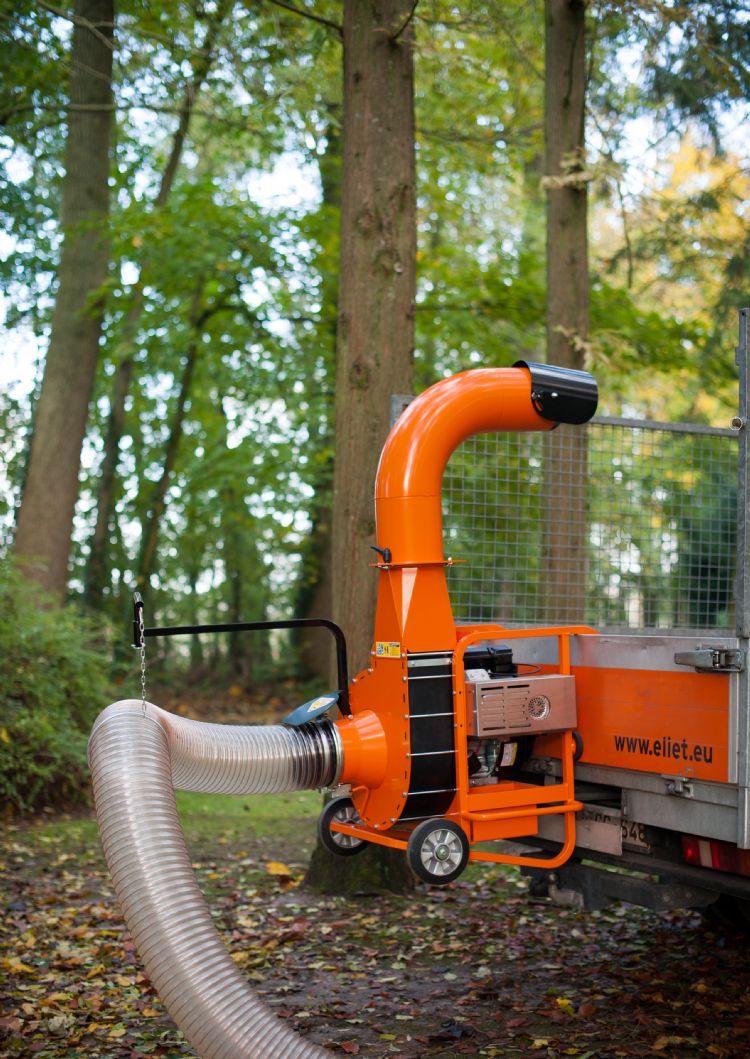 'De kiepkar gebruikten we in eerste instantie alleen om het afval van de hakselaar in op te vangen. We vinden het onnodig om materiaal in de loods te hebben staan dat maar voor één doel wordt gebruikt. Toen kwamen we op het idee om die kiepkar ook voor het bladafval te gebruiken, maar daarvoor moest een koppeling met de bladzuiger worden gemaakt. Onze dealer van park- en tuinmachines, Gerrie Rasing Handel en Reparatie, en Stierman de Leeuw, importeur van park- en tuinmachines, hebben ons bij deze constructie geholpen. Toen moest er een bladzuiger komen met genoeg power voor de grote volumes en waar onze jongens graag mee werken. De keuze viel op de Eliet TL 450 PRO HD (HD staat voor heavy duty), vanwege de kracht van zijn 18 pk-motor, maar ook om arbotechnische redenen. De transparante zuigslang steunt op zwenkbare wieltjes, ook wel swinghandle genoemd, die met een beugel op de meest comfortabele hoogte is in te stellen. Dit betekent dat onze jongens niet de hele dag de zuigslang hoeven te tillen, waardoor bladzuigen geen lichaamsbelasting meer oplevert. Bovendien maakt deze machine door de geluiddempende voering van de slang nauwelijks lawaai', aldus Huinink.