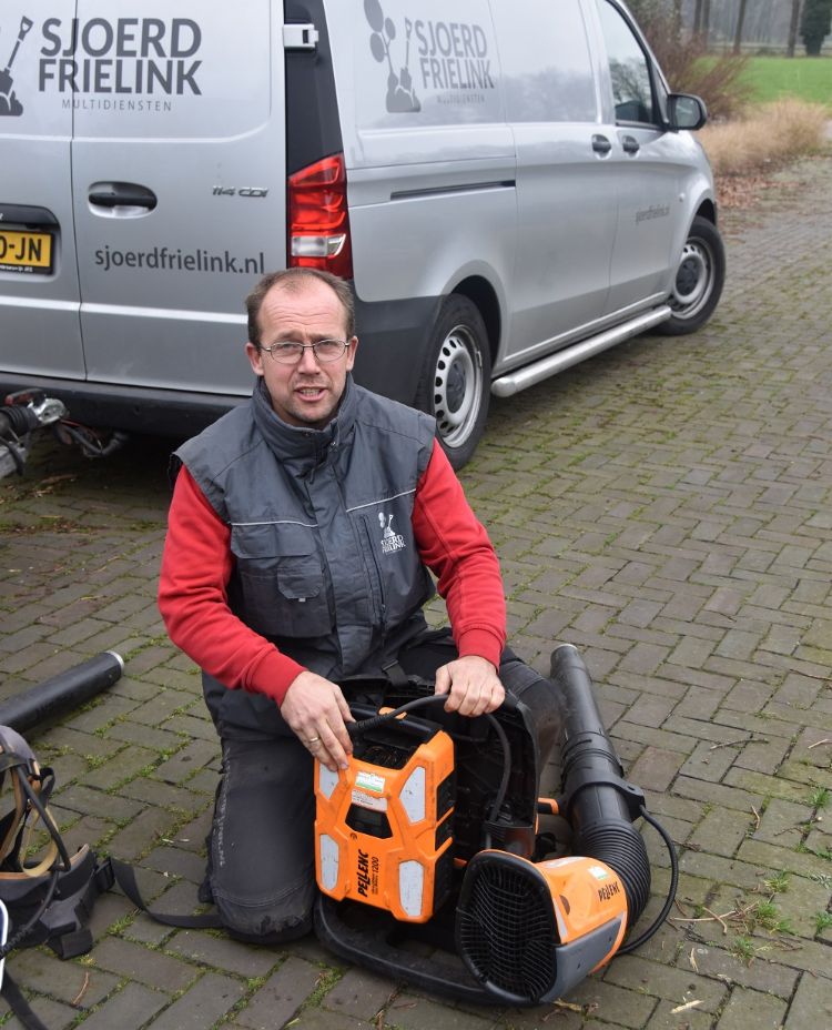 Bij deze goede relatie van de Voorster Pellenc-dealer hebben ze al vijf maanden ervaring met het Airion Backpack, die een nieuwe generatie Pellenc-machines van elektriciteit voorziet. Frielink, met circa 30 medewerkers, gebruikt bij het hovenierswerk, boomverzorging, bestratings- en grondwerk wel meer accu-aangedreven gereedschap. Het bedrijf, dat inmiddels 17 jaar bestaat, richt zich naast particulieren ook op zakelijke partijen. De werkbus van medewerker Edwin Tolkamp spant de kroon als het om accu-aangedreven gereedschap gaat. Het merendeel hiervan draagt de naam Pellenc, zoals we constateren op de klus waar hij bezig is.