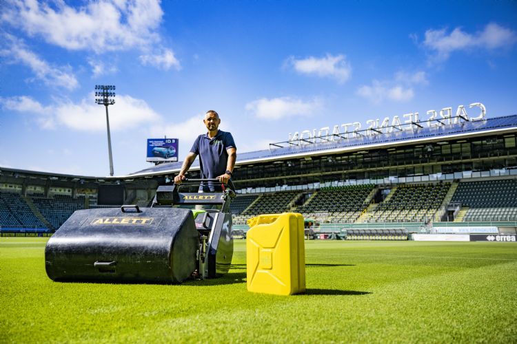 Vrij vervolgt: 'Ook dit zijn loopmaaiers. Dankzij de zuigende werking halen we daarmee de rommel uit het veld. Maaien is dus niet het hoofddoel, maar het gezond houden van de grasmat. Omdat ADO Den Haag zijn eigen stroom opwekt met zonnepanelen, kunnen we met de accumachines zeer duurzaam werken. De machine gebruikt stroom uit vier accu's en daarmee kunnen we het stadionveld met gemak maaien. De accu's zijn uitwisselbaar met de beide Allett Uplift-cirkelmaaiers. En wat het onderhoud betreft: Allett construeert zijn machines zodanig dat ze zich gemakkelijk en eenvoudig laten onderhouden, en daarnaast zijn ze bedrijfszeker.'