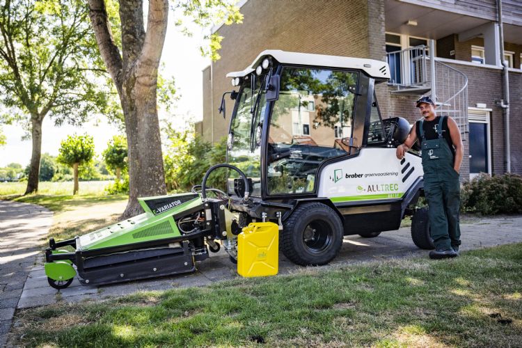 Volgens Kleinloog is Braber Groenvoorziening een vooruitstrevende partij, waarmee AllTrec al een aantal jaren samenwerkt. 'Braber is een van de vijf early adopters die de machine hebben gekocht voordat hij geproduceerd was. Ze hebben die stap gezet op basis van het vertrouwen dat zij in ons hebben en ons verhaal over deze werktuigdrager. Begin dit jaar kwamen de eerste voertuigen beschikbaar. Braber koos voor de werktuigdrager met het middelste accupakket, 50 kW. Met één machine kun je zowel borstelen als onkruid met hete lucht bestrijden door middel van de Air Variator 100. Het verwisselen van de werktuigen vraagt twee à drie minuten, dus je hebt slechts één machine nodig in plaats van meerdere, zoals voorheen.'