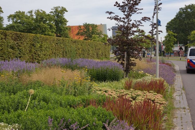 De plantvakken van totaal ruim 700 m² zijn ontworpen met diverse soorten vaste planten uit het GreentoColour sortiment van Griffoen Wassenaar in verschillende kleuren en hoogtes. De middengeleider is ingetekend met een basisbeplanting in een middenstrook van geranium 'Azure Rush'. Deze geranium is goed bodembedekkend en wordt niet al te hoog. Aan weerskanten van deze strook staan repeterende groepen vaste planten waaronder Nepeta, Stachys, Hemerocallis, Aster, Salvia en Geums. Deze soorten repeteren over de gehele lengte, waardoor er eenheid ontstaat.