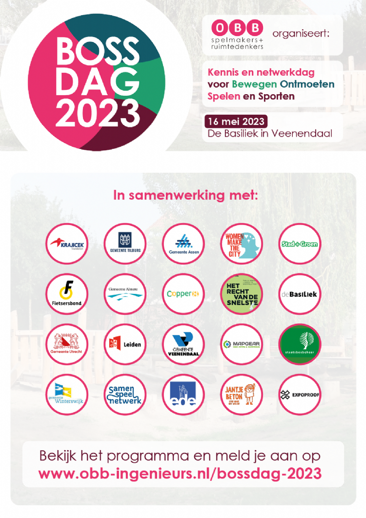 Op 16 mei 2023 organiseert OBB spelmakers + ruimtedenkers een ultiem kennis- en netwerkmoment: de BOSS-dag 2023, een kennis- en netwerkdag voor ambtenaren van regionale en lokale overheden op het gebied van BOSS (Bewegen, Ontmoeten, Spelen en Sporten) in de openbare ruimte. Een inhoudelijk sterk programma afgewisseld met netwerkmomenten biedt deelnemers die 16e mei een volledige kennis- en netwerkdag op het gebied van BOSS. Het doel van de dag is om van alle deelnemers gepassioneerde amBOSSadeurs te maken, zodat zij zelf met deze thematiek in hun gemeente/provincie/organisatie aan de slag gaan of blijven. De BOSS-thematiek en visie raakt veel beleidsgebieden en ambtelijke programma's, zowel in de gebruikswaarde/hardware als in de belevingswaarde/software en in de toekomstwaarde/orgware. Voor al deze invalshoeken zijn er interessante lezingen en workshops. Juist de integraliteit van de thema's en aanpak krijgen de ruimte op deze dag.