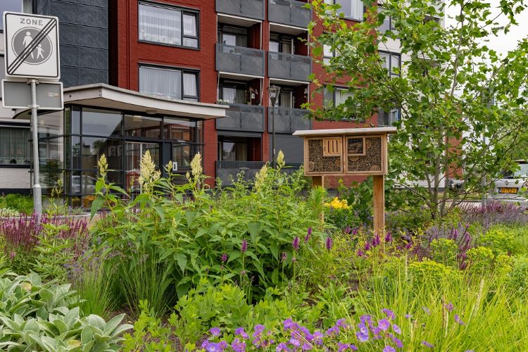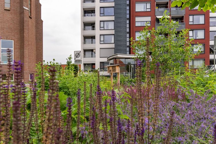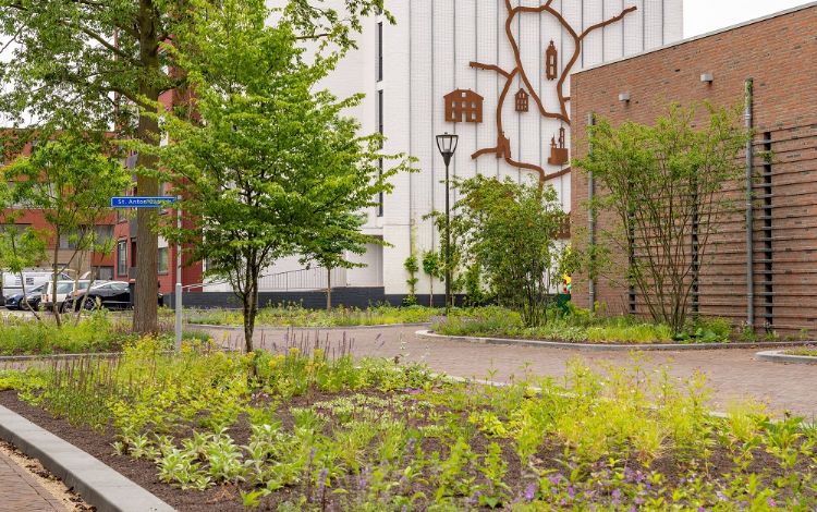Het bouwteam schakelde Lageschaar Vaste Planten in voor het klimaatadaptieve groen. 'Samen met Kragten bepaalden we welke plantensoorten van de uitgangslijst geschikt waren voor dit project', vertelt eigenaar Laurens Lageschaar. 'Het was vervolgens nog een hele uitdaging om de 24 soorten in de door Kragten aangegeven verhouding in de verschillende vakken te planten. We moesten flink passen en meten om de juiste structuren te bepalen. Er was immers geen beplantingsplan, enkel een plantenlijst met groepsgrootte-percentage en aantallen per vierkante meter.'