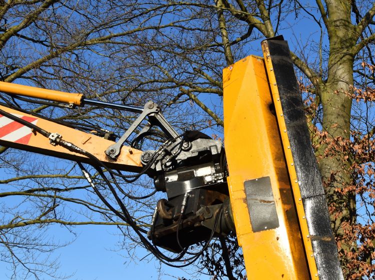 Het maaidek dat Beeftink aan zijn giek heeft, is duidelijk bestemd voor het grovere werk; voor het keurig bijsnoeien van een haag zul je een andere oplossing moeten zoeken. Uit informatie van Scheers Machines blijkt dat hun kleinere maaidek zeker geschikt is voor het fijnere snoeiwerk. Beeftink: ‘Mijn maaidek verbrijzelt zelfs takken ter dikte van een koffiebeker. Vaak vind je dit soort takken in een singel hoog in de boom. Als je al werkend op hoogte zo’n dikke tak tegenkomt, vind ik het bijzonder gemakkelijk dat ik de voorklep van het maaidek open kan zetten. Dit gebeurt hydraulisch. De rotoren grijpen de tak dan en verbrijzelen hem. Anders zou ik de giek moeten laten bewegen om zo’n uitstekende tak onder het maaidek te krijgen.’ Het openen van de voorklep beïnvloedt uiteraard de aerodynamische eigenschappen van het maaidek, dat het restant van de dunnere takken en het gehakselde blad met de luchtstroom in de bosschages spuit. Bij de opdracht die Beeftink in Duitsland uitvoerde, werden de grove delen die achterbleven na het snoeien apart opgeruimd.