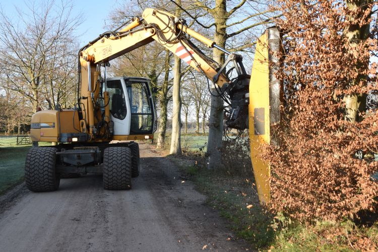 Om zijn ambities te realiseren, investeerde Beeftink in een gebruikte graafmachine van een gerenommeerd Duits fabricaat. In zijn loods staat er een aantal sterke smalspoortractoren, een wegenschaaf, een bosklepelaar en diverse werktuigen voor onderhoud van grootgroen. Ik bezoek hem op zijn bedrijf in Vorden. Bij aankomst koppelt hij net de laatste hydraulische slangen aan zijn nieuwe takkenslagmaaier, zodat we die in werking kunnen bekijken. Deze machine is van het merk SMZ en is geproduceerd door Scheer Machines. Beeftink nam zijn nieuwe maaidek voor windsingels medio november 2022 in gebruik. Hij ziet direct mijn aarzeling en verklaart desgevraagd: 'Scheer Machines geeft dit soort dekken meestal een groene poedercoating, maar ik wilde een gele versie, omdat dit beter bij de kleur van mijn Liebherr-kraan past. Met deze takkenslagmaaier hebben we inmiddels 120 kilometer windsingels bijgesnoeid tot een hoogte van 5 tot 6 meter. Dat was best wel een lastige klus, want in Duitsland hebben ze veel bruggen. Daar moet je dan onderdoor zien te komen of je moet een eind omrijden. Als ik er met de cabine onderdoor kon, deed ik dat uiteraard met gestrekte giek.'
