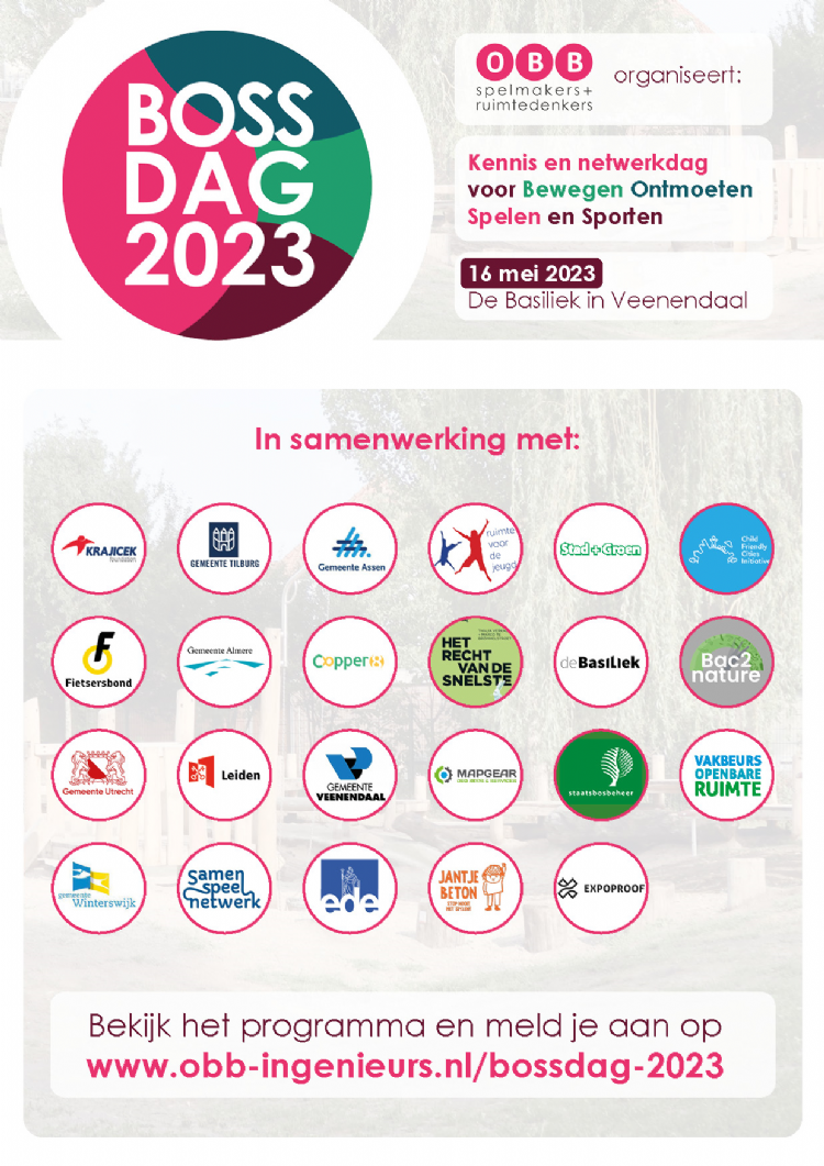 Op 16 mei 2023 organiseert OBB spelmakers + ruimtedenkers daarom dit ultieme kennis- en netwerkmoment: de BOSSdag 2023, voor ambtenaren van regionale en lokale overheden op het gebied van BOSS (bewegen, ontmoeten, spelen en sporten) in de openbare ruimte.