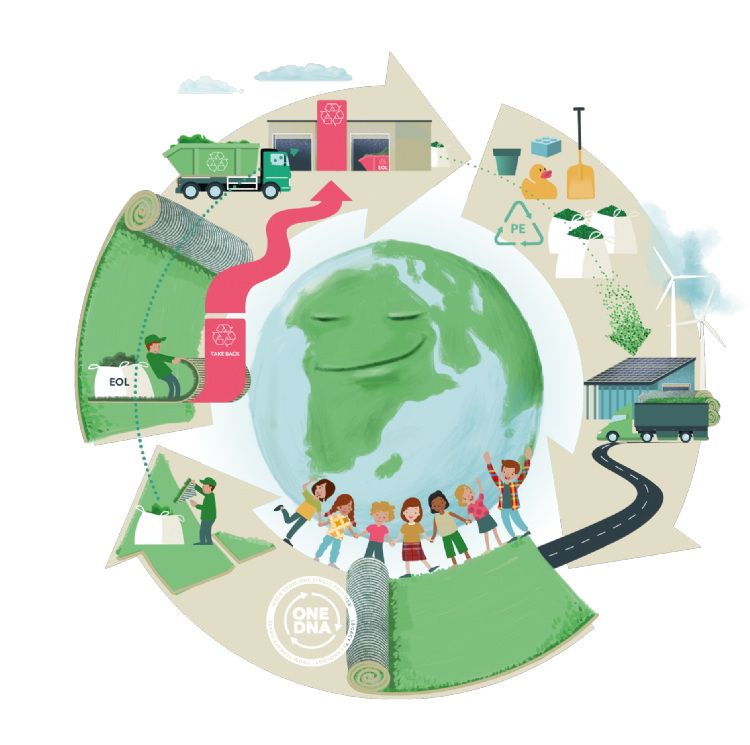 LimeGreen ONE-DNA is circulair kunstgras. De volledige grasmat bestaat uit slechts één grondstof, waardoor deze volledig gerecycled kan worden. Samen met circulaire componenten zoals invulzand, shockpads en fixatielatten vormt dit kunstgras een volledig duurzaam systeem; niets belandt op de afvalberg. Algemeen directeur Jasper Eppingbroek van LimeGreen: 'Met LimeGreen leg je schone en kleurrijke speel- en sportveldjes en schoolpleinen aan voor onze kinderen, met óóg voor hun toekomst.'