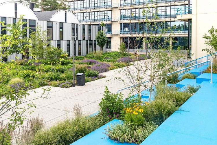 In 2018 verbouwde de UT het Hogekampgebouw tot een hotel en studentenhuisvesting. Hiervoor moest ook de buitenruimte opnieuw worden aangelegd. In 2019 gaf Andre de Brouwer van de UT LOLA Landscape Architects en Griffioen Wassenaar opdracht om een ontmoetingsplek te ontwerpen met maar liefst 5.500 m2 GreentoColour. 'LOLA Landscape had een vrij frivool eindbeeld voor ogen', vertelt Peters. 'Daarom dachten ze niet in eerste instantie aan ons. Wij werden daardoor uitgedaagd om daar met gebruik van GreentoColour toch invulling aan te geven. Want het moest wel GreentoColour zijn, met de bijbehorende lage beheerkosten. Bij ons start dan een creatief proces. Onze landschapsontwerper maakte een schets en legde die aan LOLA voor. Vanuit het voorlopig ontwerp ontstaat dan het definitieve ontwerp.'