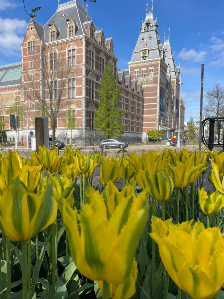 | Tulpenvakken in de museumtuin aan de achterzijde van het Rijksmuseum |