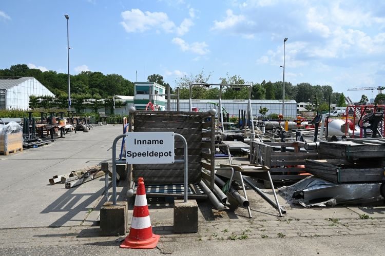 | | Het depot aan de Kosterlaan is rijkelijk gevuld met gebruikte materialen en speeltoestellen. |