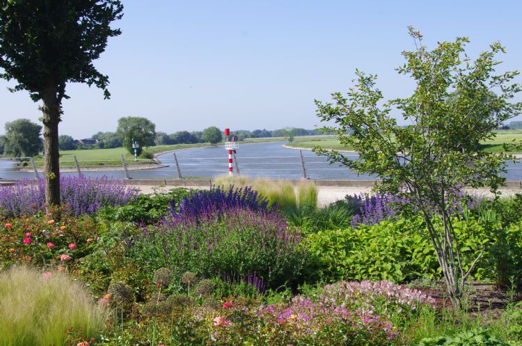 Het beplantingsplan dat Moors hier heeft toegepast, is een voortzetting van een concept dat hij eerder ontwikkelde voor een begraafplaats in Putten. Het gaat om een vasteplantenconcept. 'We zorgen eerst voor de plekken van de solitairen. Wanneer die erin staan, wordt een op maat samengesteld mengsel van zaden van vaste planten daartussen verspreid met als bedoeling dat je een sluitende bodembedekkende beplanting krijgt die bovendien jaarrond een spannend beeld oplevert.' Het ontwerp van de perken sluit aan bij de golvende en natuurlijke beweging van de IJssel. Op de oevers is afzetgesteente te vinden: grote IJsselkeien die in de ijstijd hier terecht zijn gekomen. De bewegingen van de rivier worden weerspiegeld in de vormen, materialen en beplantingen. Zo worden veel begin- en eindpunten van de plantvakken geaccentueerd door grote IJsselkeien. Van daaruit ontstaat er als het ware een 'stroming' van beplanting. Het beeld begint rustig, vormt zich naar onstuimig en weer terug naar rustig.