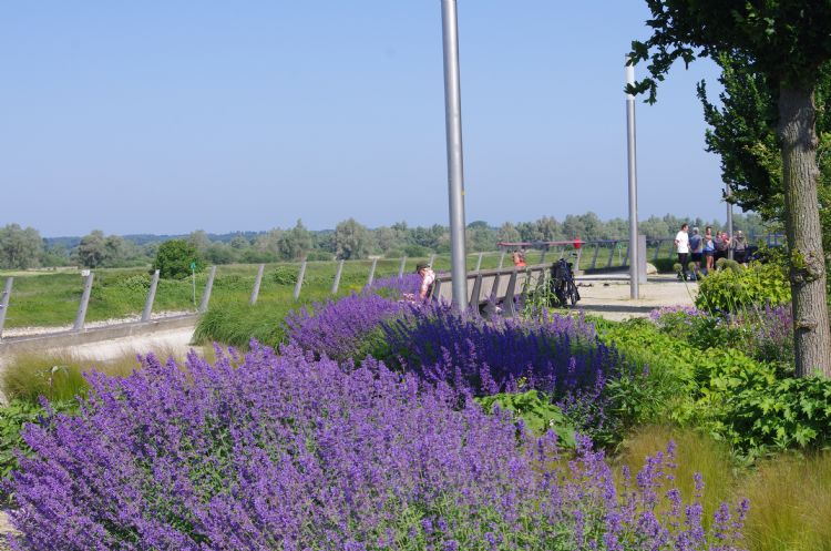 Kenmerkend voor het landschap is de scherpe overgang van natuur naar bebouwing. 'We hebben er nadrukkelijk op gestuurd om die overgang te verzachten,' zegt Moors daarover. 'Dat zie je in het macro-ontwerp, in de wijze waarop de plantvakken de vormen van de rivier volgen, maar ook in meer detail, door de randen van de plantvakken te verzachten. Veel begroeiing hangt over de randen, waardoor de overgangen van plantvak naar halfverharding minder scherp wordt.'