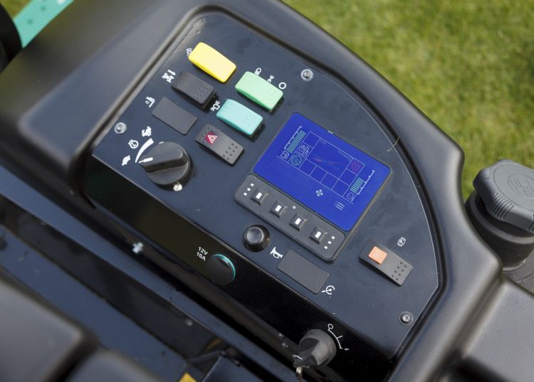 De cabine biedt een goede, comfortabele werkplek voor de machinist, met zicht rondom en ergonomisch goed uitgedachte en bereikbare bedieningspanelen met onder meer drie joysticks. 'Bij een nieuwe tv verwachten we dat hij het direct doet, dus zodra de stekker in het stopcontact zit. Dat geldt ook bij deze machine, zonder dat je alles vooraf moet instellen. De machine doet het gewoon meteen en de chauffeur kan het per definitie niet fout doen na de opheffing van de automatische maaidekvergrendeling tijdens het transport. Ik zeg over de Ransomes MT503 (zie video op https://youtu.be/Ke7TIkdRGWo) altijd dat het een premium-product is met veel luxe die ook in de uitgebreide software verborgen is. Net als bij een nieuwe tv hebben persoonlijk instellingen namelijk niet direct prioriteit. De finetuning komt later wel. Uiteraard heeft de machine diagnosetools aan boord en geeft hij de gebruikelijk attentiesignalen omtrent het functioneren weer in het beeldscherm. Het systeem geeft met een pincode de werkplaats of de fleetowner toegang tot diverse cruciale instellingen. Zo kan bijvoorbeeld bij meerdere chauffeurs en machines een identieke manier van gebruik vastgelegd worden tijdens maaien of transport. Denk hierbij aan het accelereren en vaart verminderen, snelheidsbegrenzing tijdens maaien of transport, de wijze van heffen van de klepelunits of het inschakelen van de omkeerventilator bij de radiateur.' De uitgebreide mogelijkheden die de software kent om optimaal met de machine te werken, licht rayonmanager Jasper Zwarst meestal pas toe zodra er enige ervaring met de machine is of wanneer de afnemer daaraan behoefte heeft.