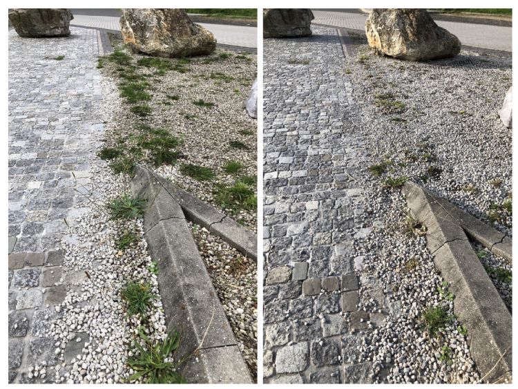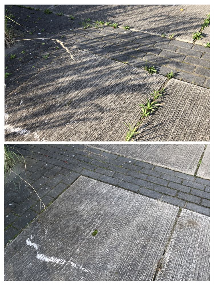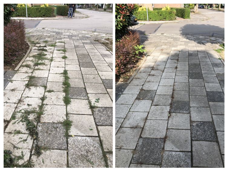 | | Het resultaat op halfverharding vlak voor de behandeling en na 31 dagen. |