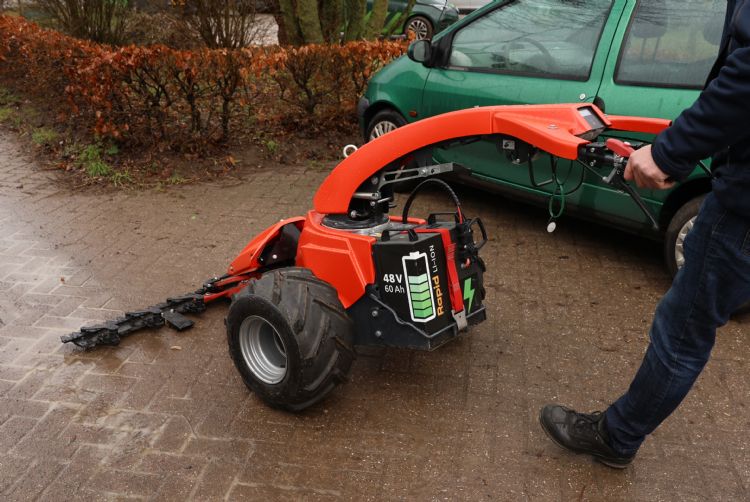 | | Het accupakket staat achter op de machine en is eenvoudig te wisselen. Het pakket weegt iets meer dan twintig kilogram. |