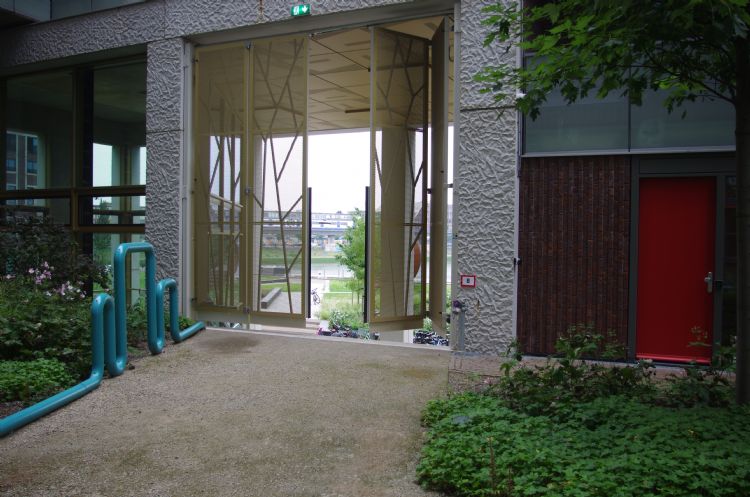 Dat is meteen bij aankomst te zien. Wie voor de hoofdingang van het complex staat, voelt hoe het gebouw zich, middels zichtlijnen en de inrichting van de directe omgeving, verbindt met het water van de Maashaven. 'De Maashaven krijgt in de toekomst een groot park. Daar kijkt de hoofdingang nu al op uit, op de plaats waar straks de industriële en stedelijke skyline plaatsmaakt voor groen. In Katendrecht vindt veel stedelijke herontwikkeling plaats. Het gebied voor de poort van De Groene Kaap is een soort schakelpunt, een woonwijk met een wijkparkje dat de verbinding moet gaan vormen tussen het park in de Maashaven en De Groene Kaap. Je ziet hier eigenlijk al de manier waarop de stedenbouwkundige lijn is doorgezet in de openbare ruimte. We hebben hier wel wat schetsen voor gemaakt, voor dit wijkparkje, maar de gemeente heeft het uiteindelijk zelf aangelegd.'