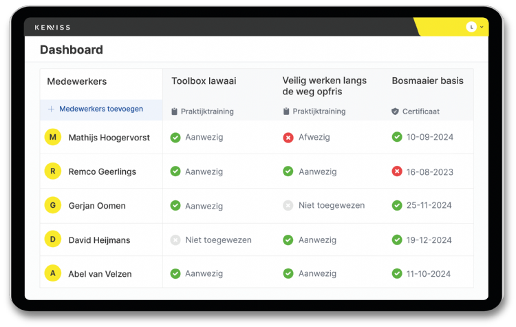 'Met de Auteurstool, ook een onderdeel van het KENNISS-leerplatform, kunnen bedrijven zelf alle informatie digitaliseren die ze willen', vertelt Van Arendonk. 'Daarnaast kunnen ze gebruikmaken van de leercontent van aangesloten opleiders en leveranciers van materiaal. Zo kunnen ze hun eigen aanbod samenstellen. Dat kan ook worden ingezet voor nieuwe medewerkers. Wij geven aan hoe een goed onboarding-traject eruitziet, maar uiteindelijk bepaalt de werkgever welke informatie voor nieuwe medewerkers erin wordt opgenomen en in welke vorm dat gebeurt.' Jansonius vult hem aan: 'Het platform, inclusief het Leermanagementsysteem, is interessant voor meerdere lagen in de organisatie. Dat je trainingen en behaalde certificaten zo in kaart kunt brengen, is handig voor de afdeling hrm. Op het dashboard kun je in één oogopslag allerlei informatie per medewerker zien, bijvoorbeeld bij welke trainingen hij aanwezig was en wanneer zijn certificaten verlopen. Stel, ik wil van bepaalde personen zien wanneer het certificaat Veilig werken langs de weg verloopt. Ik selecteer dan de betreffende medewerkers, klik op Veilig werken langs de weg en zie direct van iedereen de status. Zo kan elke beheerder zijn eigen overzicht maken met de gewenste trainingen, certificaten en documenten in combinatie met de bijbehorende medewerkers. Ook medewerkers kunnen profiteren van het overzicht dat het platform geeft van hun certificaten en opleidingen. Ze zien ook welke trainingen er nog gegeven worden en ontvangen via het systeem een uitnodiging. Er staat een agenda op het platform.'