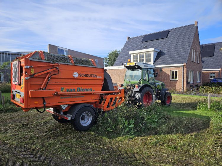 'Naast bermen onderhouden we dijken en taluds, waarbij deze machine goed van pas komt', vervolgt Van Diepen. 'En die opdrachten komen er steeds meer, nu het Hoogheemraadschap deze werkzaamheden vaker uitbesteedt. Onderlangs de dijken, op de hellende gedeelten, gebruiken we dan een Herder-giek met een klepelbak en afvoerbandje. En voor het kleinere werk gebruiken we een Kuhn-armklepel met afvoerbandje. Die werpen het maaisel naar de top van het dijklichaam. Daar raapt de Faunus het maaisel op, shreddert het en blaast het in de kipcontainer. Dat gaat veel sneller en gemakkelijker dan bijvoorbeeld met een opraapwagen. De machine leent zich uitstekend voor het oprapen van blad. We hebben dan ook proeven gedaan met het oprapen van uitsluitend blad op bijvoorbeeld (half)verharding in parken. Zoiets doe je uiteraard met de draaiende rotor, zonder dat de messen de bodem raken. Op terreinen waar huttendorpen staan, kunnen we de grasmat weer netjes gemaaid en vrij van achtergelaten rommel opleveren.'