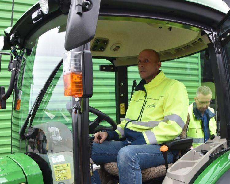 De collega's bekijken en becommentariëren de nieuwe aanwinst uitvoerig. Voorman John van Eijk vertelt ondertussen dat ze met zijn allen bepaald hebben wat voor soort tractor er moest komen: 'Deze krijgt een plaats naast de grotere John Deere en de Steyr-tractor die er al zijn. Het moest een krachtige, multifunctionele, compacte machine zijn met een ruime cabine die rondom goed uitzicht biedt. Omdat voor het maaien van de sportvelden de oude compacttractor al dienstdeed, zou ook onze nieuwe tractor op brede gazonbanden moeten staan. De tractor is namelijk nogal wat zwaarder dan de Kubota die we nu daarvoor gebruiken.' De materieelbeheerder van de gemeente Medemblik, Leon Deen, vult aan dat er uiteindelijk aan drie partijen prijsopgave gevraagd is voor min of meer vergelijkbare compacttractoren. Deen: 'De John Deere inclusief de gewenste aanpassingen zat qua prijs in de middenmoot. De stabiliteit van deze tractor dankzij zijn breedte gaf uiteindelijk mede de doorslag. We gaan er namelijk niet alleen sportvelden mee maaien, maar komen er ook mee in bospercelen om hout te versnipperen. Daar is stabiliteit en comfortabel rijden natuurlijk zeker gewenst.'