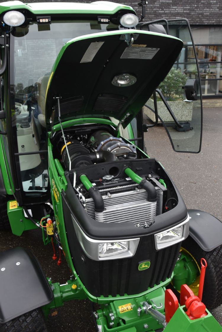 Standaard beschikt de JD 4066R over vierwielaandrijving, een Yanmar-viercilinder-turbodieselmotor met inlaatluchtkoeler en een dieselpartikelfilter in de verbrandingslucht. De Winter vertelt hierover: 'De krachtige 66pk-Yanmar-dieselmotor levert genoeg vermogen bij het werken onder zware belastingen. Daarbij gaat de motor vrij zuinig om met de brandstof en produceert hij weinig lawaai. Deze dieselmotor zit in emissieklasse Tier 4 Final. Afhankelijk van het gebruik moet het partikelfilter regelmatig geregenereerd worden. Dit gebeurt volgens een geautomatiseerde procedure. Zoals tegenwoordig gebruikelijk is, passeert de lucht voor de verbrandingsmotor een droog luchtfilter, bestaand uit een dubbel element met waarschuwingssensor.' Het doet bijzonder aan dat je op deze tractor tevergeefs naar een uitlaat boven de motorkap zult zoeken. De schone verbrandingsgassen verlaten de motorkap namelijk via een soort rooster. De onderdelen van de motorkap bestaan net als de voor- en achterspatborden uit stevige kunststof. De medewerkers noemen dit een pre: 'Het roest niet. En mocht het beschadigd raken, dan is het veel gemakkelijker en goedkoper te vervangen dan een onderdeel uit plaatstaal.'