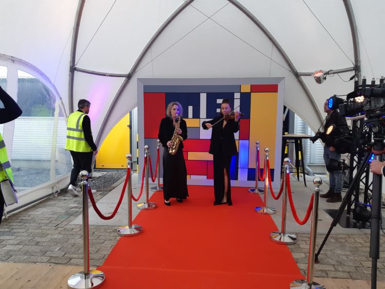 De fabriek, vernoemd naar schilder Piet Mondriaan, is op feestelijke wijze geopend woensdag 22 oktober. De sfeer is goed, een drietal muzikanten zorgt voor een goede stemming.