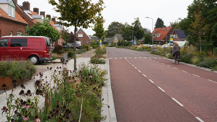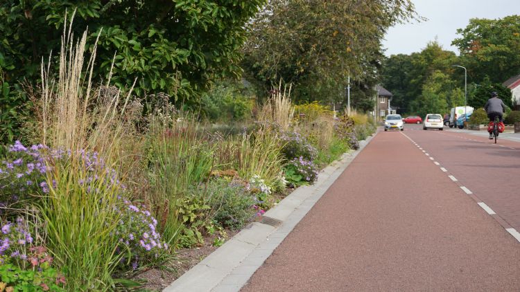In samenwerking met landschapsarchitect Buro Ontwerp & Omgeving en aannemer NTP bekeek de gemeente hoe het groen meerdere SDG's zou kunnen dienen. 'We wilden lokale leveranciers dicht bij huis bij de herinrichting betrekken en het groen laten aansluiten bij het ontwerp van de landschapsarchitect', aldus Sikking. 'Zo kwamen we al vrij snel uit bij Lageschaar Vaste Planten. Dat bedrijf kon een concept neerleggen waarmee de biodiversiteit een impuls zou krijgen. Aan hand van dat concept hebben we een bijensnelweg gerealiseerd met wisselend bloeiende beplanting, die loopt van het ene naar het andere uiteinde van de straat. Behalve biodiverser hebben we de omgeving ook klimaatadaptiever gemaakt. Dankzij de inrichting loopt het water automatisch in de groenstroken en de lavasteen onder de prairiebeplanting heeft een groot waterbergend vermogen. Hierdoor hoefden we minder ondergronds leidingwerk en bergingscapaciteit aan te leggen.'