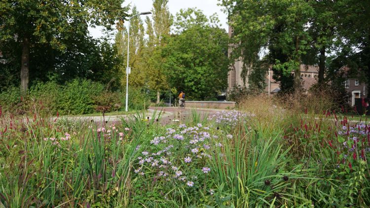 Lageschaar Vaste Planten maakte 2.517 m2 Prairie Garden op maat voor de klimaatadaptieve en groenere herinrichting van de Admiraal de Ruyterstraat en Dijkstraat. Het systeem is bestand tegen extreme hoosbuien en in droge periodes voorkomt het uitdroging van de grond en van planten. De beplanting werd in het voorjaar van 2021 gemaakt in drie variaties: voor grote vakken, (half)schaduwvakken en smalle stroken. Sikking is ervan overtuigd dat er nu heel andere beplanting langs de wegen had gestaan als er niet volgens de SDG's was gewerkt. 'Vanaf de beginfase van het traject hebben we onze beheerders meegenomen in het verduurzamingsproces en het werken met SDG's. Met het concept van Lageschaar is er veel minder groenonderhoud nodig. Voorheen heerste het idee dat planten veel onderhoud vergen; daarom werd er bijvoorbeeld vaak voor gras gekozen door onze afdeling Beheer. Nu zie je echt een omslagpunt ontstaan.'