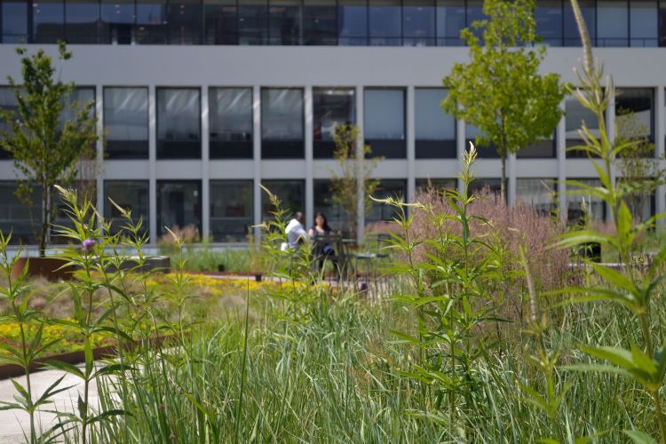 De beplanting speelt een belangrijke rol bij de inrichting van het dakpark. Siergrassen zijn afgewisseld met vaste planten in blauwgrijze tinten en de beplanting heeft een rijke variatie aan texturen en kleuren. Door de verschillende bloeitijden en seizoenskenmerken van de beplanting kun je de seizoenen optimaal beleven. Ook zijn er veel soorten toegepast die bijen, hommels en andere insecten aantrekken. Door slim om te gaan met de substraatdikte was het mogelijk om een divers beplantingsbeeld te maken en is er zelfs ruimte voor een aantal bomen. De belasting op het dak varieert van 100 tot 250 kg/m2. De Dakdokters heeft de beplanting hierop afgestemd.