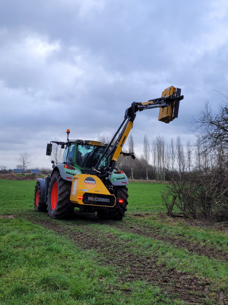De maaiarm waar Kuipers voor koos, is de McConnel 'Power Arm' PA6070, (https://youtu.be/2hMqQeB5q2M), waarvan de giek uit twee delen bestaat en een maximale reikwijdte heeft van 6,20 meter. De achter de tractor aangebouwde machine levert tot wel 70 pk aan het werktuig. De complete machine hangt in de hefinrichting achter de tractor. De machine is aangekoppeld in de driepunts-hefinrichting, in combinatie met een driepunts-stabilisatieframe. Optioneel is een as-aanbouwsysteem leverbaar. Kuijpers: 'Voordat je hem aankoppelt, staat de McConnel op zijn eigen stevige poten op de grond. Vlakstelling in de lengte en de breedte gebeurt traditioneel door de topstang en een hefstang in te korten. En uiteraard borg je het geheel met pennen.' Dit systeem levert volgens Kuijpers een starre verbinding op: 'Dat merk je ook in de transportstand. Het geheel gaat niet dansen op oneffenheden van het wegdek bij hoge snelheden, althans niet meer dan de tractor doet. En dat is beperkt, omdat de soepele tractorbanden voor een behoorlijke demping zorgen in de cadans van de tractor.'