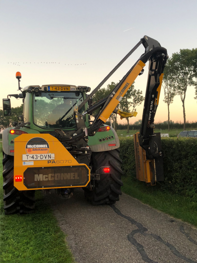 Dat zorgde voor een stroomversnelling, want al de volgende ochtend meldde salesmanager Jac Peeters van Dabekausen zich bij Kuijpers: 'Hoewel een nieuwe maaiarm niet meteen mijn bedoeling was,' vertelt Kuijpers, 'heeft hij me kunnen overtuigen te investeren in een nieuwe McConnel-arm. Ik heb mijn uurtarief iets moeten verhogen, omdat de investering hoger uitviel dan ik begroot had. Daar stond wel iets tegenover: de maaiarm die ik koos, kon Dabekausen namelijk binnen enkele weken leveren. Tijdelijk heb ik hagen onderhouden met een 120 centimeter-klepelbak aan de nieuwe maaiarm. Verder had ik een roterende maaibak besteld. Maar die bestelling heeft uiteindelijk plaatsgemaakt voor een nieuw model 150 centimeter brede maairotor en met bedienbare klep en een hydraulisch in hoogte verstelbare steunrol. Dit aanbouwwerktuig is uitgevoerd met zware F14-hagensnoeiklepels. Je hoeft niet van werktuig te wisselen als je omschakelt van hagen snoeien naar het klepelen van ruw grasland. Deze klepelbak heeft geen afzuiging; hopelijk spaar ik hiermee ook het leven van wat insecten of andere kleine dieren. Ik ben voor tweehonderd procent tevreden met deze flexibele combinatie waarmee ik in elk hoekje kan komen, en heb al een tweede exemplaar besteld. Ik werk nu via Van de Haar Groep veel in de gemeenten Wageningen en Arnhem met deze prachtige combinatie. Het gaat hier vooral om het onderhoud van bosschages, plantvakken en overige groen. Verder snoei ik singels rond de fruitpercelen bij fruittelers in de Betuwe.'