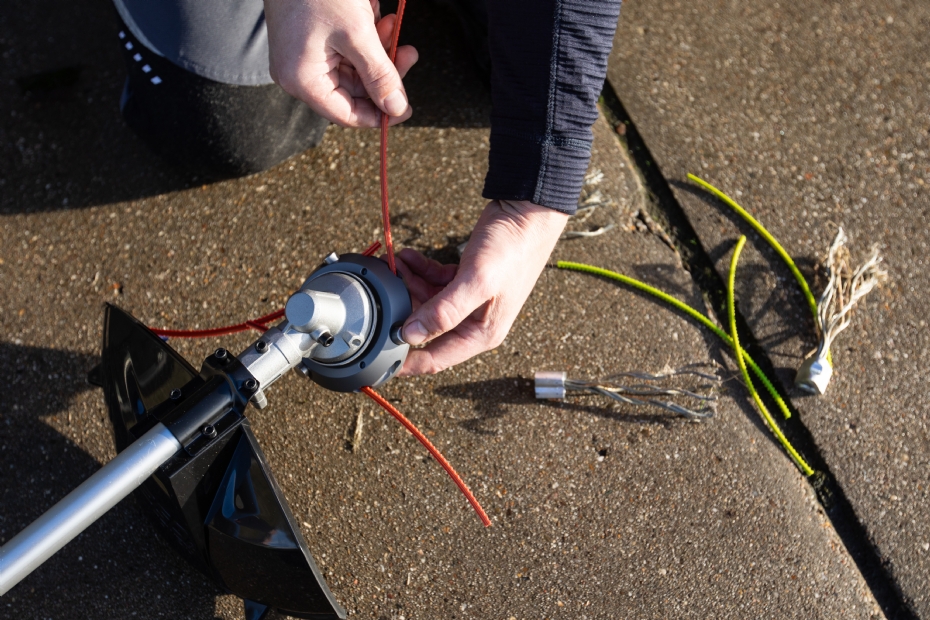 Er zitten zes gaten aan de zijkant. Regnerus licht toe: 'Het sterke Nylsaw-maaidraad kun je hierdoor helemaal door je maaikop heen voeren. Neem daarvoor drie stukken draad van circa 35 centimeter, dan steken er dus zes draden uit de kop. Hetzelfde kliksysteem zorgt er ook hier weer voor dat de maaidraad geborgd is in de maaikop. Met de zes dunnere, kortere maaidraden laat onkruid zich namelijk ook verwijderen. Dat gaat echter veel minder agressief dan met de stalen vervangborstels. Het kan geen kwaad om hiermee onkruid in de voegen of langs randen van kwetsbare stenen of tegels te verwijderen; je beschadigt bij voorbeeld ook marmer niet.' Over het onderhoud van de Armigo Multiplo is Regnerus vrij kort: 'Goed schoonhouden en af en toe het klikmechanisme een drupje olie geven.'