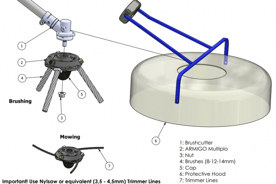 Met de Multiplo-kop kun je in luttele seconden overschakelen van onkruidborstelen naar maaien en andersom. Gereedschap hiervoor is onnodig. Regnerus: 'Wil je maaien, dan steek je drie stukken maaidraad in drie van de zes gaten aan de zijkant van de kop. Armigo adviseert daarvoor Nylsaw-draad te gebruiken in diktes van 3,5 tot 5,5 millimeter. De gebruiker kan zelf dus de lengte van de maai-/trimdraad kiezen. Hetzelfde mechanisme als bij de vervangborstels klemt ook de drie ingebrachte maaidraden. Uiteraard werkt de machine veilig en besteden we conform de CE-certificering aandacht aan het veilig werken ermee. Zo is er uiteraard ook een grote beschermkap die de hovenier moet beschermen tegen wegspattende steentjes of takjes.'